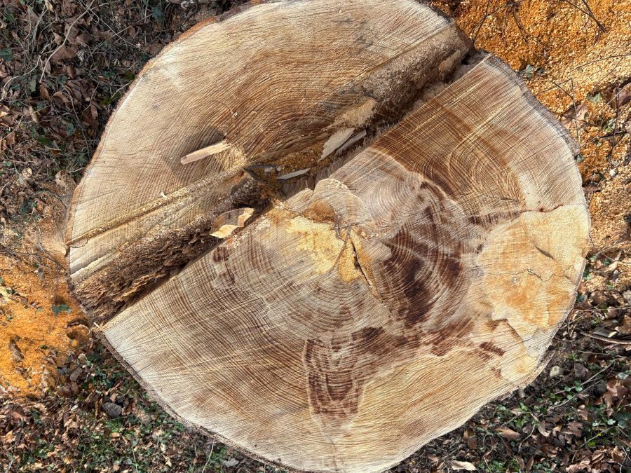 Meine Runde führte mich um den See. Etwas Ungewöhnliches sah ich weiter vorn: Ein Baum lag zerschnitten am Boden. Er hatte sein Leben verloren und hinterließ dicke Holzscheiben mit vielen Jahresringen. Ein leerer Raum war entstanden, wo vorher eine dicke Krone seine Pracht entfaltet hatte.
