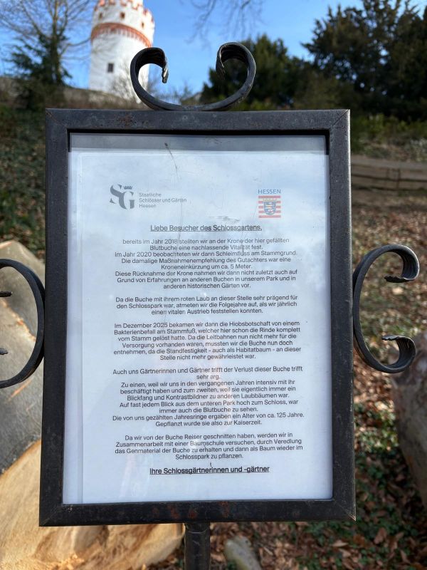 Gleichzeitig wurde mitgeteilt, dass an dieser Stelle ein neuer Baum gepflanzt werden soll, gewachsen aus dem alten. Dafür wurden Reiser geschnitten und es wird versucht, ein Blutbuchenkind zu ziehen. Wenn es gelingt und der Mutterbaum seine Kraft weitergibt, wird es viel Zeit brauchen, damit er genauso stark wird wie die Mutter.